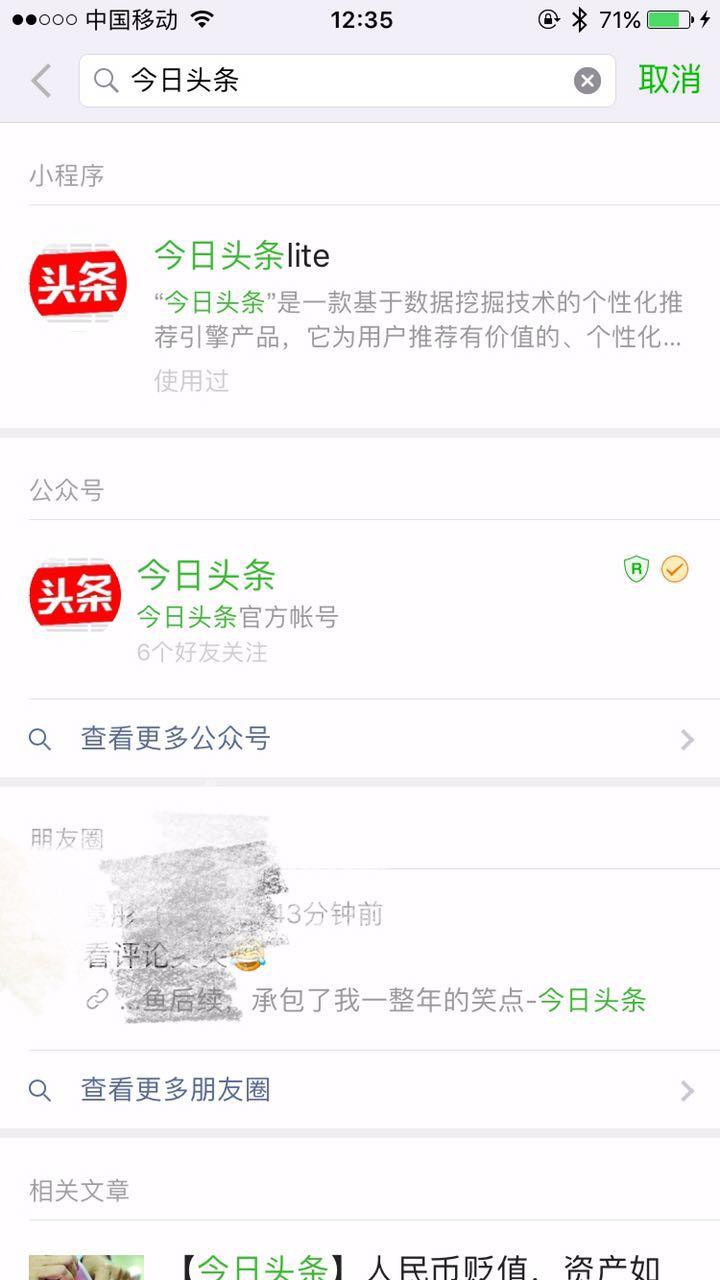 在微信客戶端最上方的搜索窗口,用戶可以通過搜索獲取小程序。解放日報·上觀新聞記者嘗試搜索了“今日頭條”,發(fā)現(xiàn)在原先的“公眾號”“朋友圈”“相關(guān)文章”等分類結(jié)果最上方,增加了一個“小程序”的類別,其中就有“今日頭條lite”這個小程序。