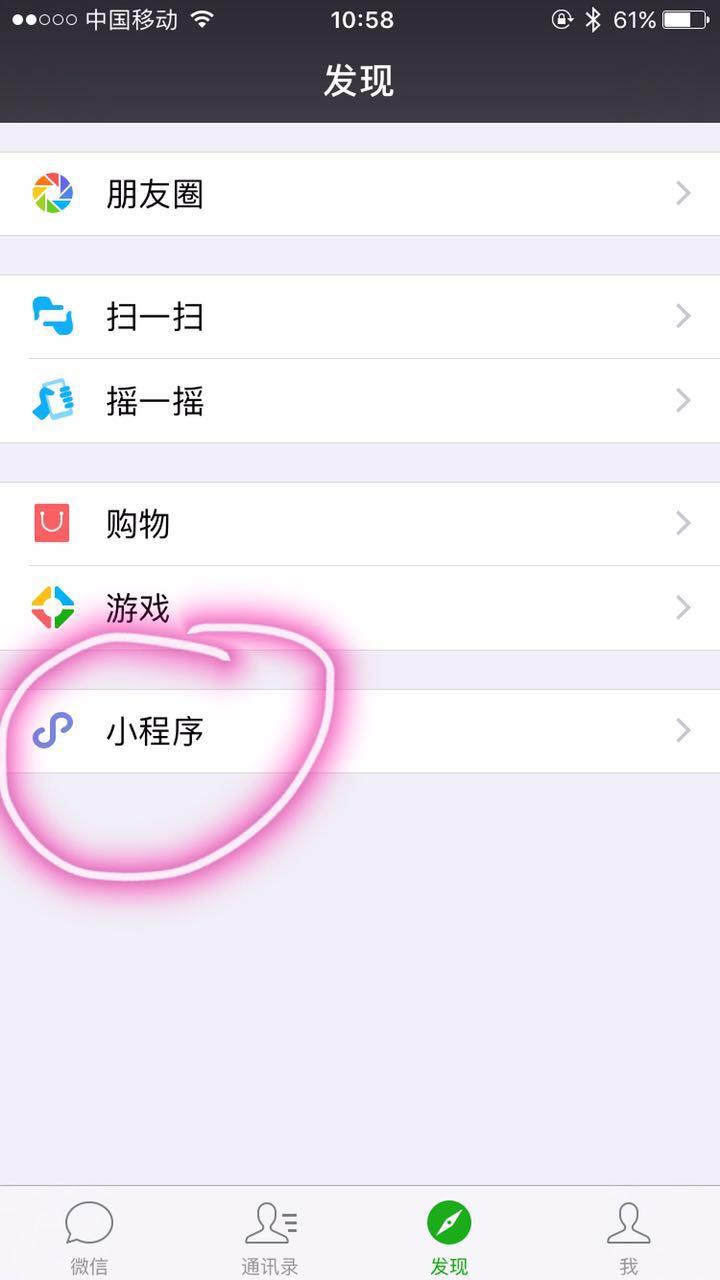 當(dāng)用戶打開過某個小程序后,可以在微信客戶端的“發(fā)現(xiàn)”欄最后一行看到“小程序”,里面羅列了這名用戶的曾經(jīng)打開過的所有小程序。如果想再次使用相關(guān)小程序,可以直接點擊;同時,用戶還能通過“發(fā)現(xiàn)-小程序”搜索其他小程序。